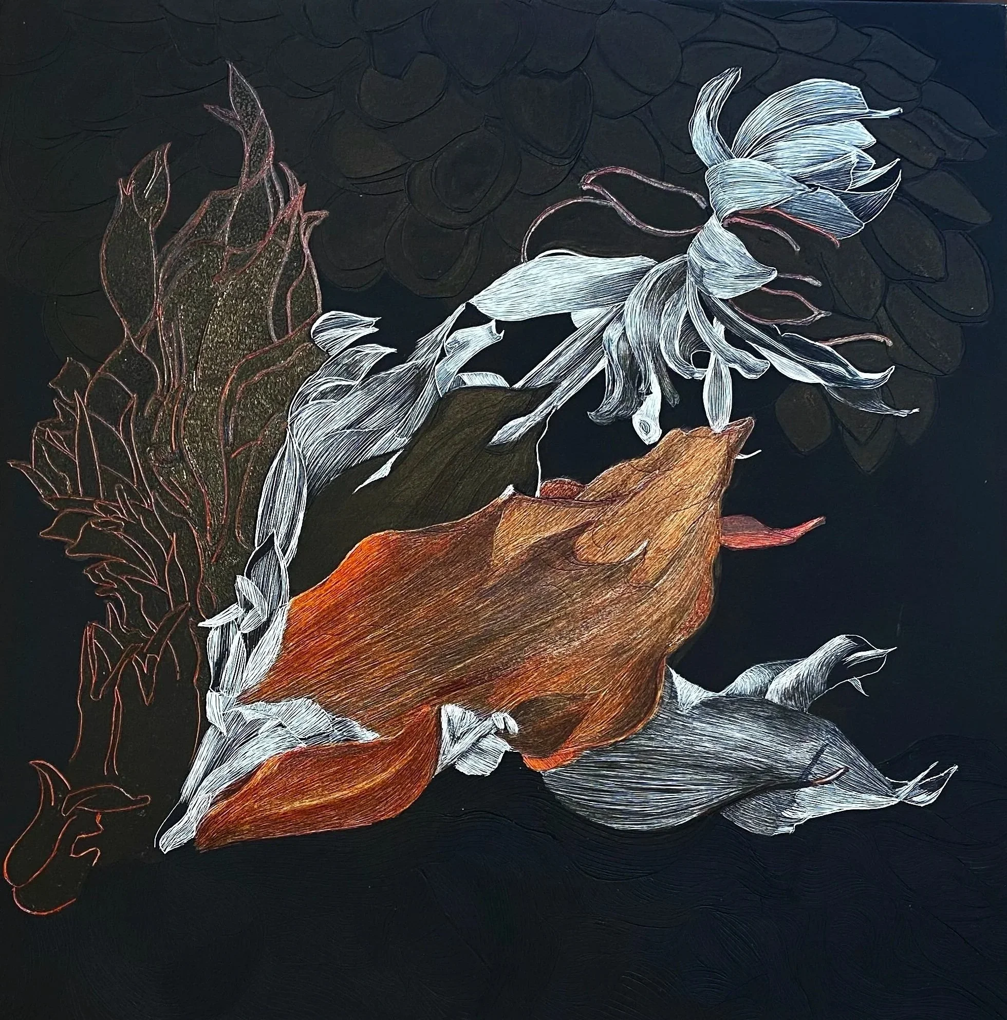 Spontaneous Combustion creates the illusion of 3 dimensions by layering line over line. Relying heavily on my discoveries of the natural world, I intertwine abstract shapes with elements from nature creating exciting designs that wind their way across the page.