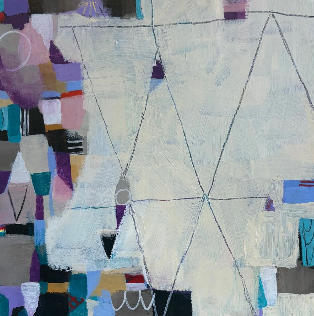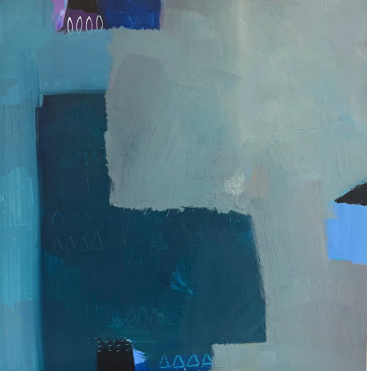 Six months ago, I hit a breakthrough painting. I let the painting be minimal and spare. Instantly, my world expanded. I was staring at a minimal painting that was just as exciting as the other worked pieces I had on the wall. In a minimal painting, the emphasis becomes about the colors and the marks. With less on the canvas, ironically there is more to enjoy. This series of paintings emerged like a butterfly out of a cocoon. The three large paintings, Limitless, Soaring and Enchanted, so beautifully capture this range of expression and expansion of scale. The rest of the paintings both contrast and complement this new world that opened up to me.
